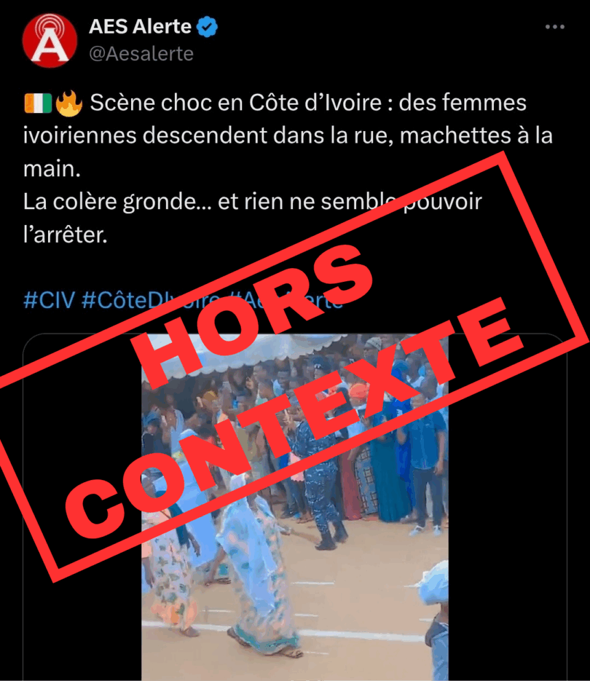 La vidéo est publiée sur x le 09 juillet 2025. La publication a généré plus de 50k vues, des centaines de j’aime et plus de 70 partages. Elle est légendée “Scène choc en Côte d’Ivoire : des femmes ivoiriennes descendent dans la rue, machettes à la main.
